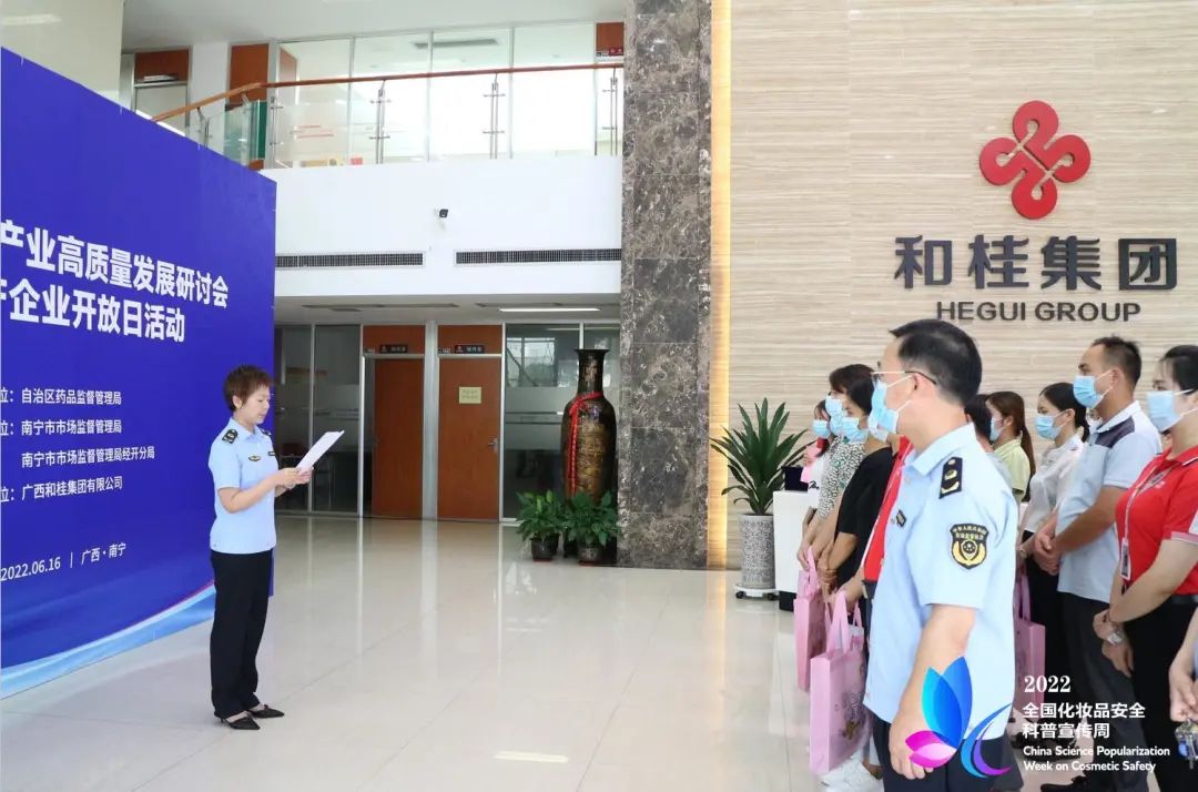 6月16日,廣西化妝品高質量發(fā)展研討會暨生產企業(yè)開放日在和桂集團舉行,作為2022年全國化妝品安全科普宣傳周廣西系列活動之一,政府高度重視,社會廣泛關注。自治區(qū)藥品監(jiān)督管理局化妝品監(jiān)管處副處長唐文,南寧市市場監(jiān)督管理局黨組成員、副局長宋剛,自治區(qū)藥品監(jiān)管局南寧檢查分局局長梁柳青,廣西化妝品協會會長、廣西和桂集團有限公司董事長黃偉文出席會議,行業(yè)專家學者、企業(yè)負責人、媒體單位,通過政府平臺公開征集的近30位公眾代表參加活動。研討會由南寧市市場監(jiān)督管理局經開分局局長金濤主持。