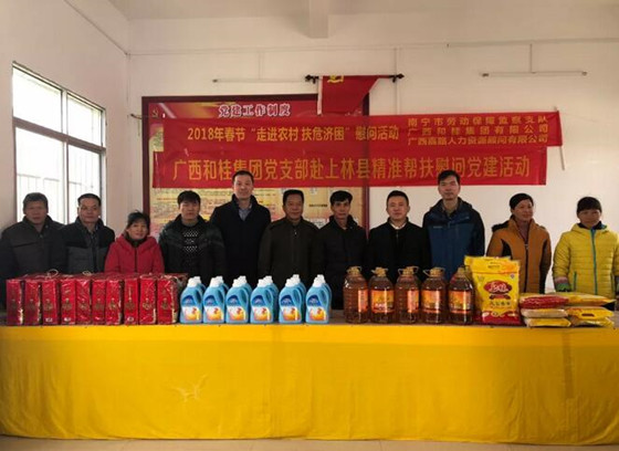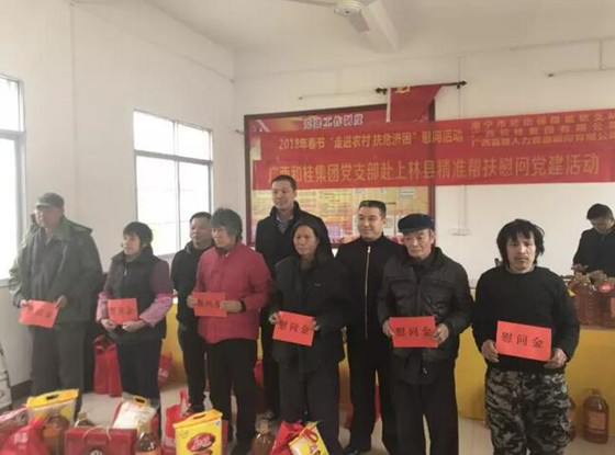 寒冬送溫暖,愛心滿和桂值2018年新春佳節(jié)即將到來之際,為了表達(dá)對困難戶、低保戶和貧困黨員的關(guān)愛和幫助,讓他們度過一個快樂、平安、祥和的新春佳節(jié)。2018年2月2日,廣西和桂集團(tuán)黨支部書記周云同志、人力行政總監(jiān)梁偉同志等一行四人代表集團(tuán)公司,會同我們的聯(lián)建單位-南寧市勞動保障監(jiān)察支隊(duì)黨支部書記趙斌同志帶領(lǐng)的支部成員,一起到南寧市上林縣白圩鎮(zhèn)龍樓村開展“寒冬送溫暖,愛心滿和桂”的精準(zhǔn)扶貧,慰問貧困戶家庭的黨建活動。慰問團(tuán)一行深入農(nóng)村,走進(jìn)貧困家庭,為他們送去了慰問金和油、米、保適潔洗衣液、節(jié)日禮包等生活用品,送去了集團(tuán)公司的關(guān)懷和溫暖。